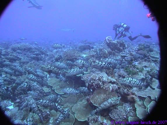 über den Zackenbarschen patrulieren die Haie auf suche nach leichter Beute